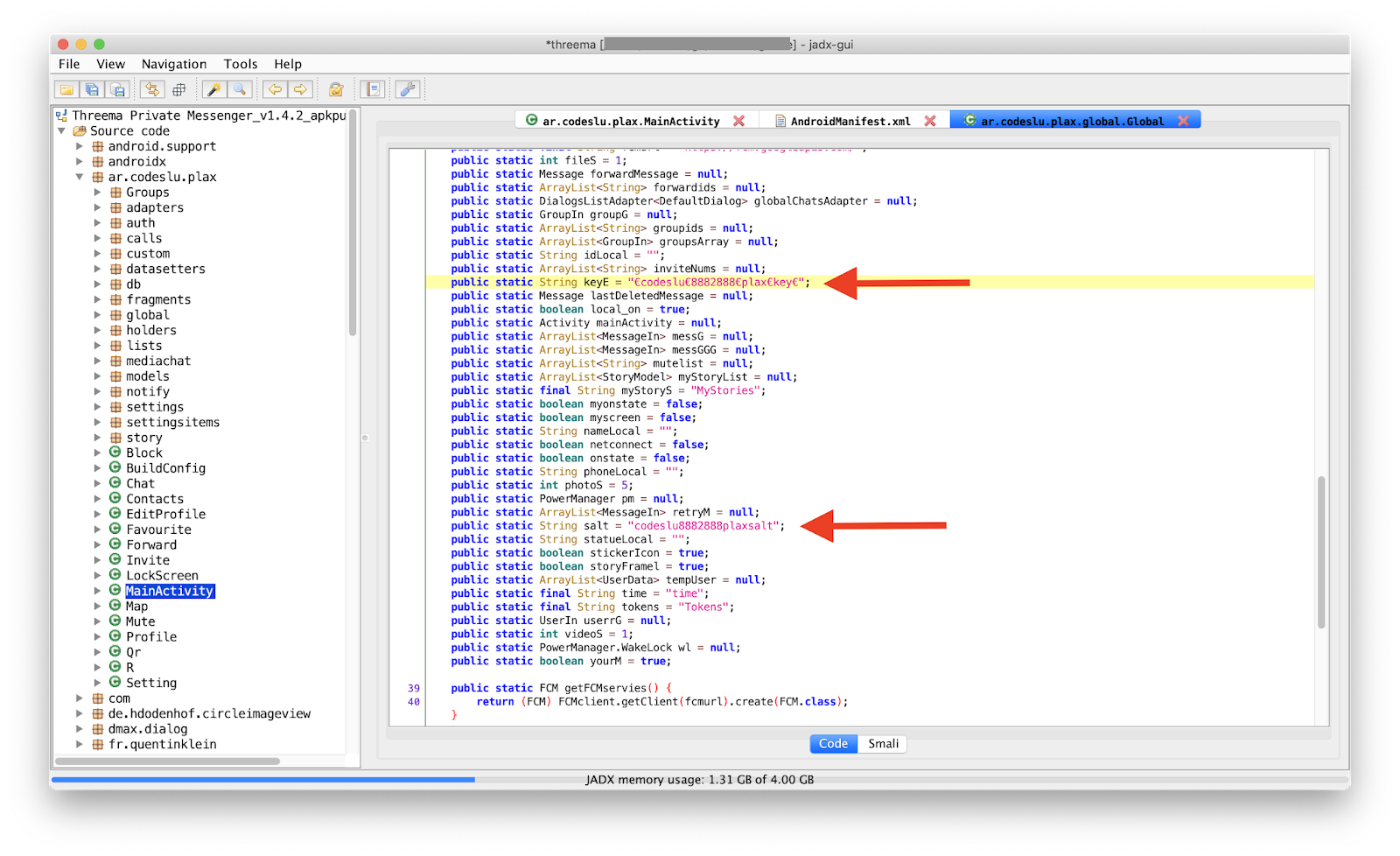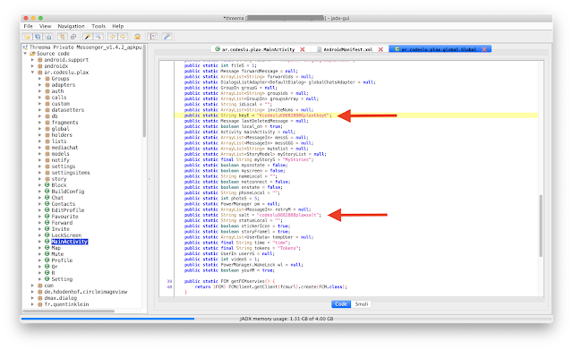 Global.USERS, Global.CHATS, Global.GROUPS and Global.CALLS. Also, an encryption object is created, it is initialized with Global.keyE and Global.salt, which are actually hardcoded values found in the ar.codeslu.plax.global.Global class (funny but irrelevant for the rest of the analysis):A glimpse at the string resources gives us information about the URLs used to connect to the Firebase database backend: